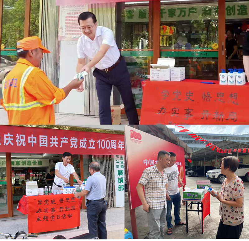 六、為與群眾共慶黨的生日,黨支部在辦公大樓下及經(jīng)營部門前開展疫情防控宣傳,并免費(fèi)贈(zèng)送口罩、洗手液、礦泉水等,F(xiàn)場激蕩著的紅色歌曲,向百姓吟誦著我們偉大、光榮、正確的中國共產(chǎn)黨一百年來團(tuán)結(jié)帶領(lǐng)中國人民書寫中華民族幾千年歷史最恢宏的史詩。