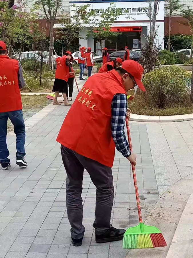 活動于14:30開始,在董事長、總經(jīng)理卓少琳的帶領(lǐng)下,全體志愿者統(tǒng)一穿戴著“創(chuàng)文為我,我為創(chuàng)文”服裝和帽子,首先對租戶門前亂擺放和車輛亂停放現(xiàn)象給予勸導(dǎo),并向他們宣傳我市創(chuàng)建國家文明城市的積極意義,引導(dǎo)他們自覺落實“門前三包”責(zé)任制,動員他們要積極響應(yīng)號召,愛護(hù)公共環(huán)境。接著,大家手持工具,對小公園等地進(jìn)行全面打掃,仔細(xì)清除地面及綠化帶上積存的垃圾雜物和路燈桿、墻面上的小廣告等,把隱藏的煙頭、礦泉水瓶、落葉等細(xì)小雜物清理干凈,并及時運(yùn)走垃圾雜物。志愿者活動的開展,不僅強(qiáng)化黨員的黨性修養(yǎng)和服務(wù)意識,為用黨建引領(lǐng)公司工作的發(fā)展打下基礎(chǔ),而且提升公司辦公場地、住宅小區(qū)、門前小公園整體環(huán)境衛(wèi)生質(zhì)量,進(jìn)一步營造了濃厚的創(chuàng)文氛圍。